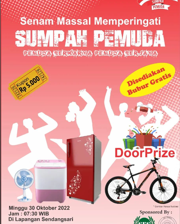 UNIT KARANG TARUNA IDAMAN DUSUN MANUKANProudly Present 💡 SENAM MASSAL💡PERINGATAN SUMPAH PEMUDA RI Ke-94Pemuda Berkarya Pemuda Berjaya 📌 Pelaksanaan:🗓️hari/tgl : Minggu, 30 Okt 2022🕘Jam : 07.30 WIB🏛️tempat : Lapangan Kamijoro🗒️acara : Senam Massal 📌 Fasilitas:1. Doorprize menarik2. Bubur gratis3. Senam Sehat4. Hiburan ____TERBUKA UNTUK UMUM________Harga Kupon IDR 5.000____ 📌 NarahubungPembelian kupon dan informasi lainnya:1. CP