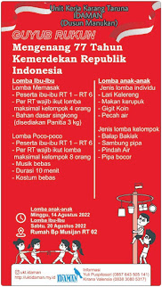Jenis Lomba Anak-anak: Individu : Syarat Peserta: Pelaksanaan:a. Hari/tgl : Minggu, 14 Agustus 2022b. Pukul : 09.00-selesaic. Tempat : Rumah Bp Musijan RT 02 Catatan Jenis lomba Ibu-Ibu: A. Lomba MemasakSyarat Peserta: Pelaksanaan:a. Hari/tgl : Sabtu, 20 Agustus 2022b. Pukul : Menyesuaikanc. Tempat : Memasak di tempat RT Masing2 Indikator penilaian B. Lomba Poco-pocoSyarat Peserta: Pelaksanaan:a.